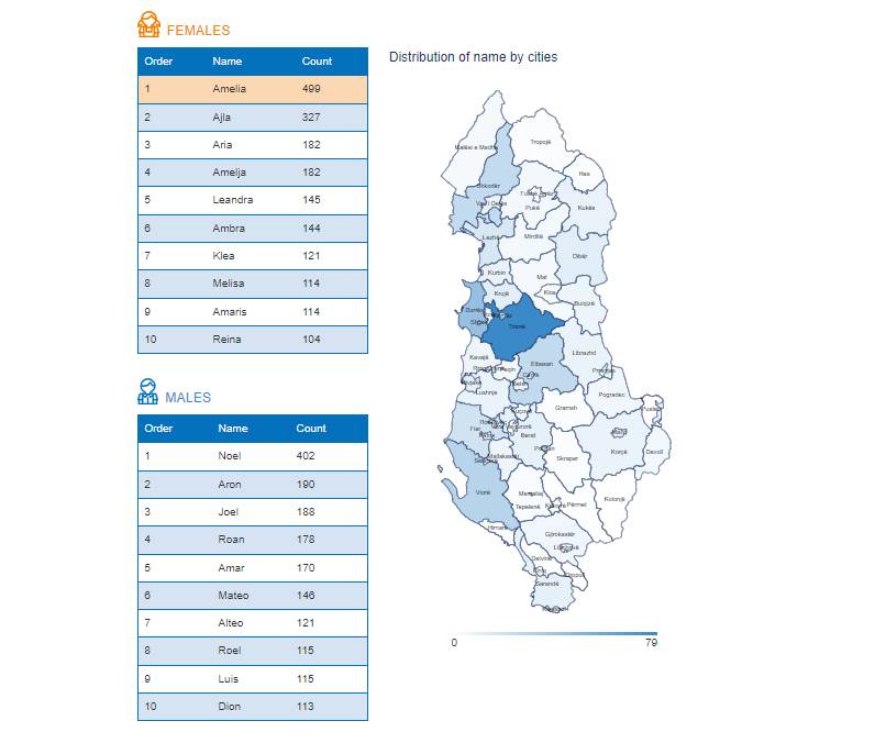 INSTAT, son bir yıl içerisinde çocuklara verilen en popüler isimlerin şehirlere göre dağılımını gösteren bir interaktif harita yayınladı. Verilere göre çocuklarına tarihi İlir isimleri veren ailelerin sayısı azalırken yeni isimlerde Arnavutluk televizyonlarında yayınlanan dizilerin tesiri görüldü.