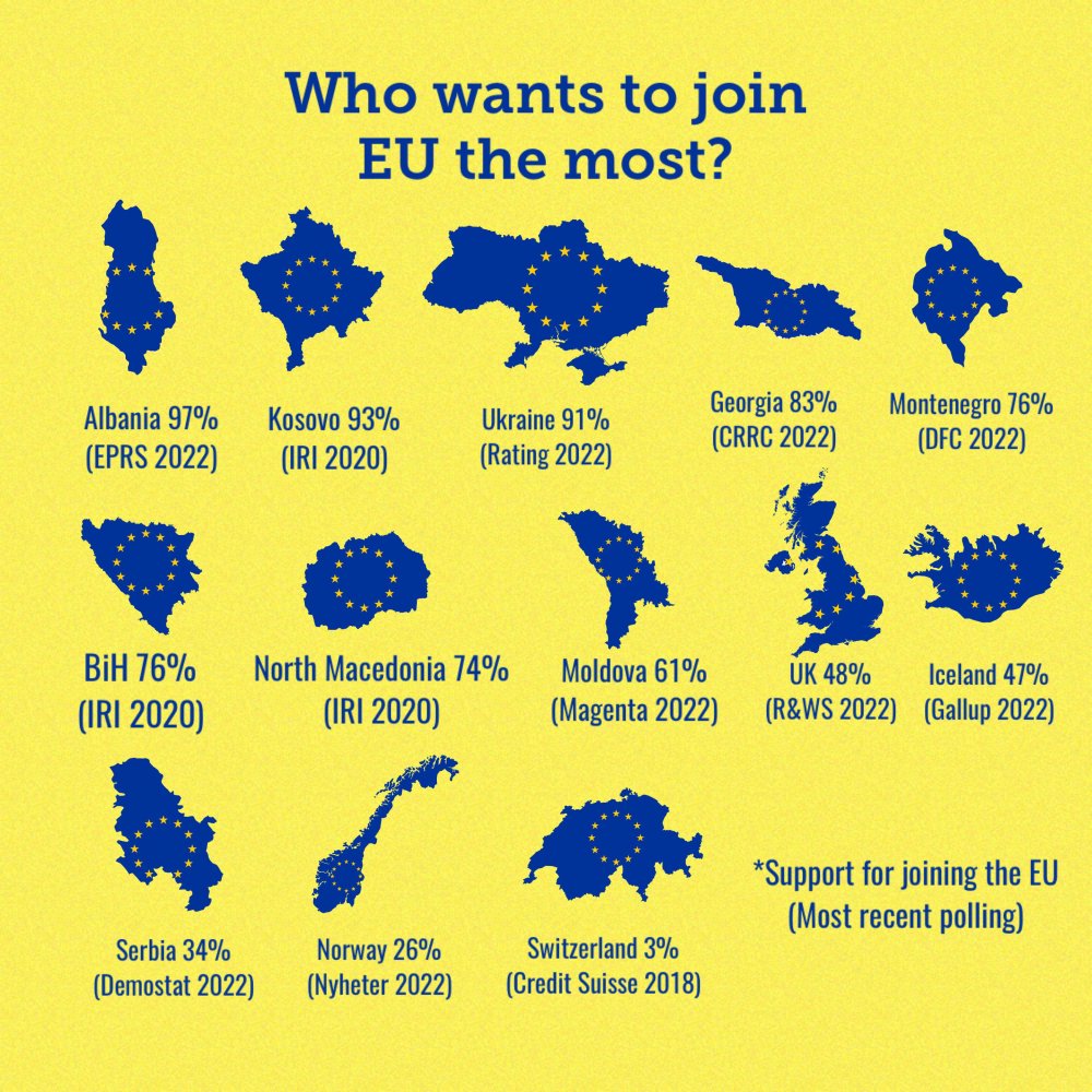 Avrupa Komisyonu İletişim Stratejisti Tom Moylan tarafından yayınlanan grafikte AB üyeliğini en fazla isteyen ilk üç ülke sırasıyla Arnavutluk, Kosova ve Ukrayna oldu.