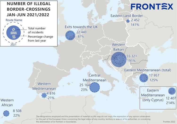 Frontex tarafından yayınlanan verilere göre 2022’nin ilk yarısında Batı Balkan ülkelerinden Avrupa’ya yaklaşık 55 bin düzensiz sınır geçişi kaydedildi.