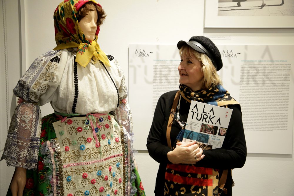 Altın renginde işlemeli geleneksel kıyafetler ve bunlara ait fotoğrafların yer aldığı sergide, kasnak işçiliği ve dantel işlemelerinden de örnekler bulunuyor.