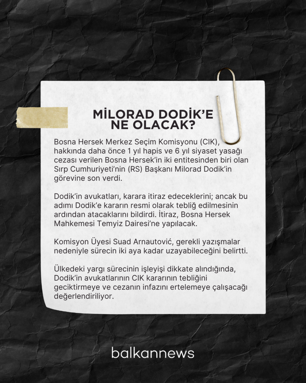 Dodik'in avukatları ise CIK'in kararına temyiz hakkı bulunduğunu belirterek, Bosna Hersek Anayasa Mahkemesine başvuracaklarını kaydetti.
