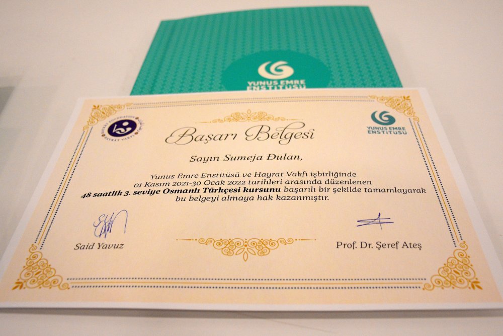 Bosna Hersek'in başkenti Saraybosna'da, Yunus Emre Enstitüsü (YEE) tarafından Hayrat Vakfı işbirliğinde çevrim içi düzenlenen "Osmanlıca-Türkçe" kursunu tamamlayanlara sertifikaları takdim edildi.