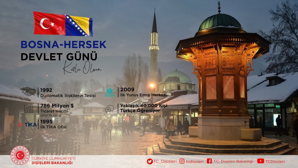Devlet Günü vesilesilye Dışişleri Bakanlığı tarafından yayınlanan mesajda “Dost ve kardeş Bosna-Hersek’in 25 Kasım Devlet Günü kutlu olsun. Bosna-Hersek’e aydınlık ve müreffeh bir gelecek diliyoruz” denildi.