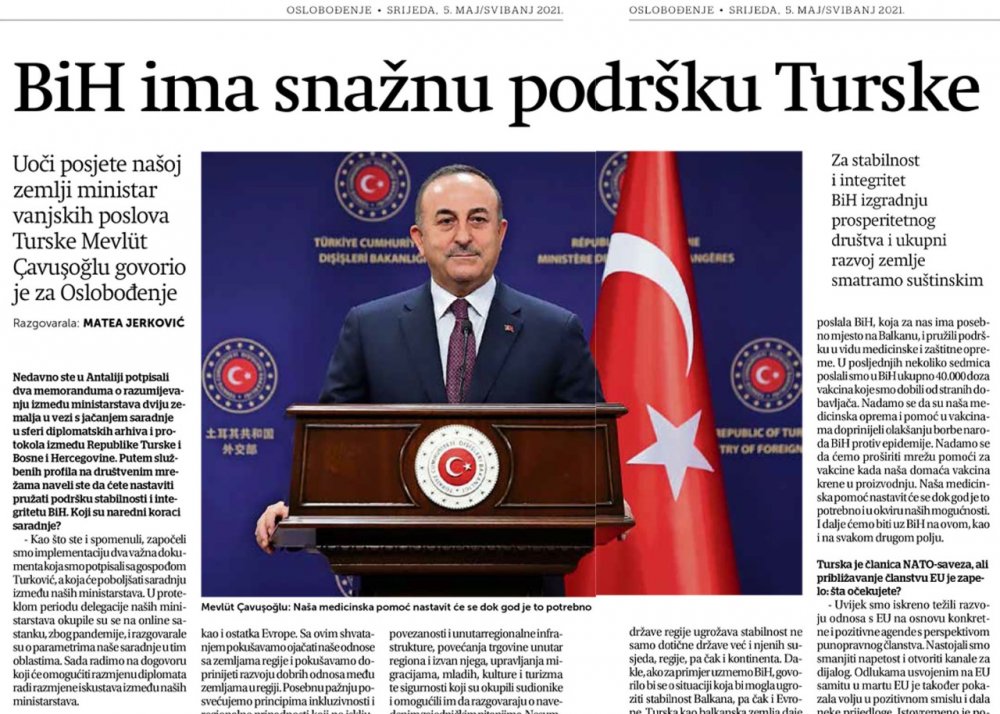 Oslobodjenje: Ülkeniz Covid-19 salgınına karşı mücadelede Bosna Hersek'e aktif olarak yardım ediyor. Vatandaşlar için 30 bin doz aşı, polis teşkilatları için 10.000 doz aşı ve koruyucu ekipman bağışladınız. Türkiye'nin de pandemi nedeniyle büyük sorunlarla karşı karşıya olduğu göz önüne alındığında, Bosna Hersek'i desteklemeye devam etmeyi planlıyor musunuz?