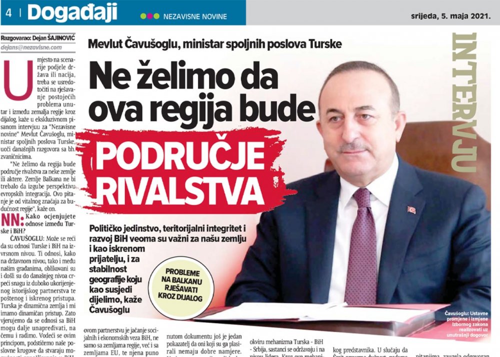Dışişleri Bakanı Çavuşoğlu, Nezavisne Novine'ye verdiği mülakatta ise Türkiye'nin tarihi, kültürel ve coğrafi açıdan bir Balkan ülkesi olduğunu vurgulayarak  bölgenin barış ve refahına büyük önem atfettiğini ve "Bölgenin birtakım ülkelerin ya da aktörlerin rekabet alanı olmasını da arzu etmediğini” ifade etti.