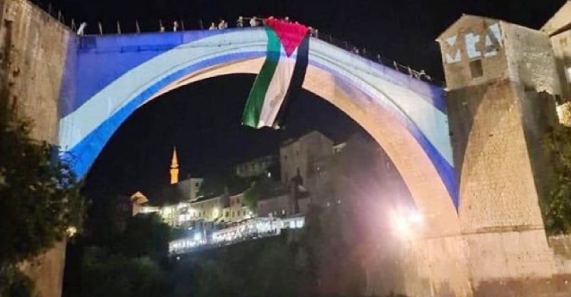 Tarihi Mostar Köprüsü üzerine İsrail’in ölen askerlerini anma günü dolayısıyla bu ülkenin bayrağının yansıtılmasına tepki gösteren bir grup, köprüye dev bir Filistin bayrağı astı.