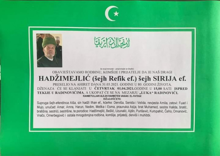 Soyu Anadolu’dan Balkanlar’a mürşid-i kâmil aramak için gelen Muhammed Meyli Baba’ya dayanan ve Şeyh Refik Hacimeyliç’in oğlu ve Şeyh Hasan Hacimeyliç’in torunu olan Sırrı Efendi, 79 yaşında vefat etti. Sırrı Hacimeyliç'in cenaze namazı, 1 Nisan Perşembe günü saat 15:00’te Radinovići’deki tekkenin önünde kılınacak.