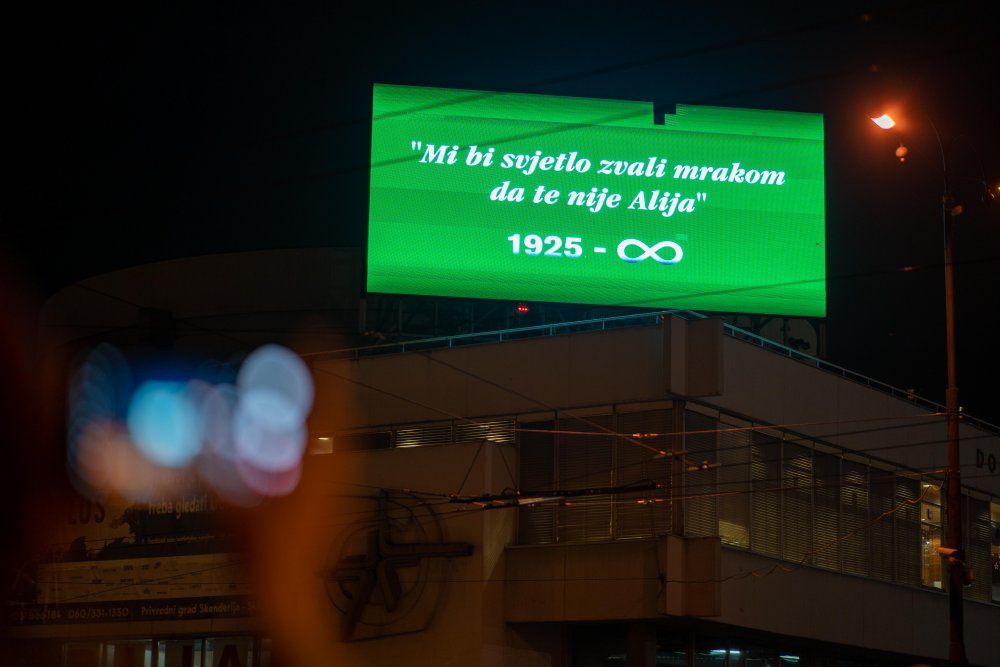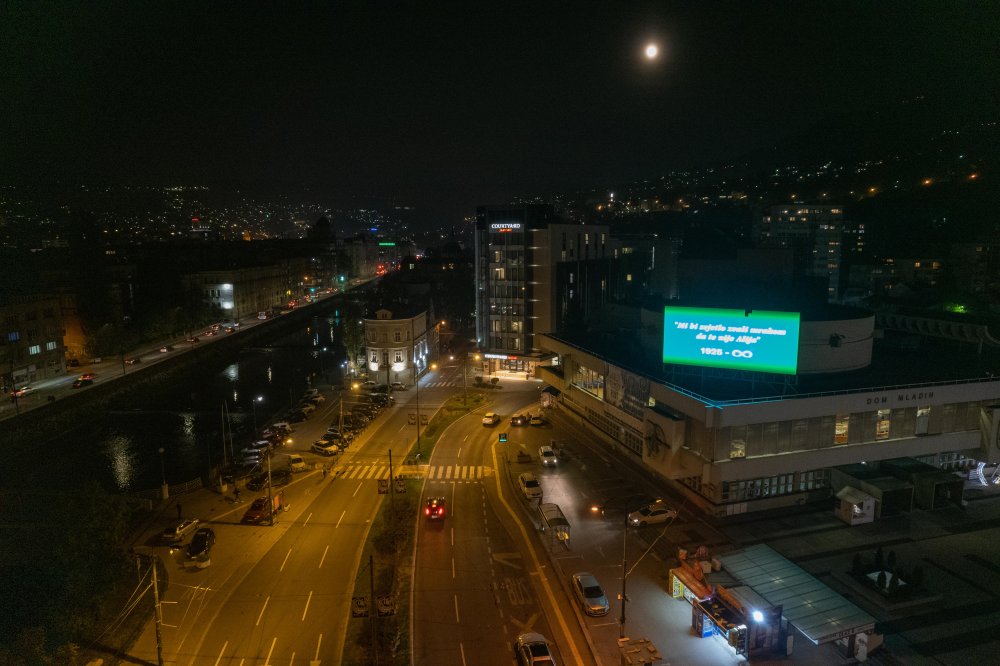 UID tarafından Bosna Hersek'in başkenti Saraybosna’da Dom Mladih Konser Salonu'nda bulunan dev ekrana “Aliya sen olmasan biz aydınlığa karanlık derdik” ifadeleri yansıtıldı.