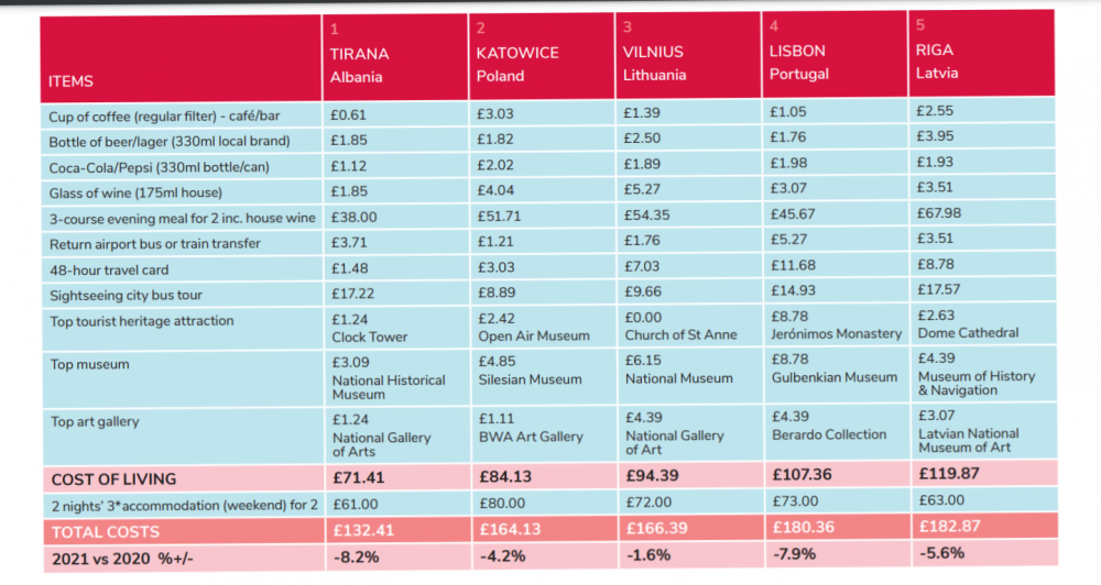 İngiltere merkezli British Post Office Travel Money isimli kuruluş tarafından bir fincan kahve, otel odası, restoran fiyatları gibi turistlerin bir şehirde yapacağı harcamalar temel alınarak yapılan bir inceleme, bir haftasonu kaçamağı için Avrupa’nın en ucuz tatil adresinin Tiran olduğunu ortaya koydu.