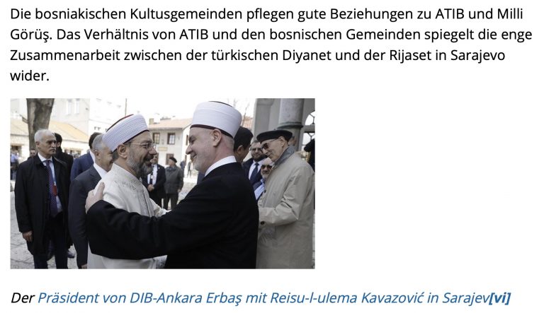 Avusturya’daki Boşnak cemaatlerinin Türk kuruluşları ATİB ve Milli Görüş ile yakın ilişkiler kurduğu vurgulanan belgede bu ilişkilerin Diyanet İşleri Başkanlığı ve Bosna Hersek İslam Birliği arasındaki yakın ilişkiyi yansıttığı kaydediliyor.