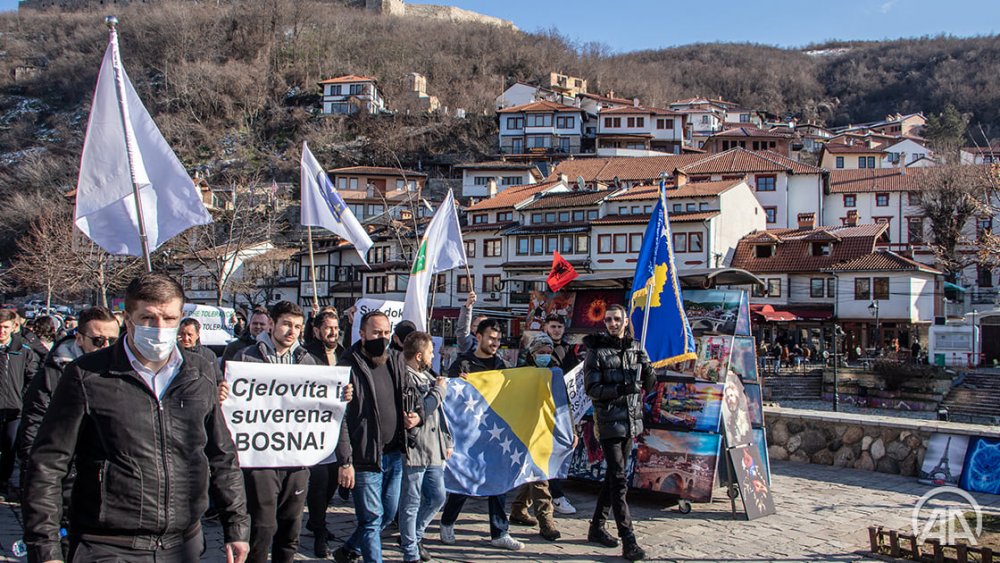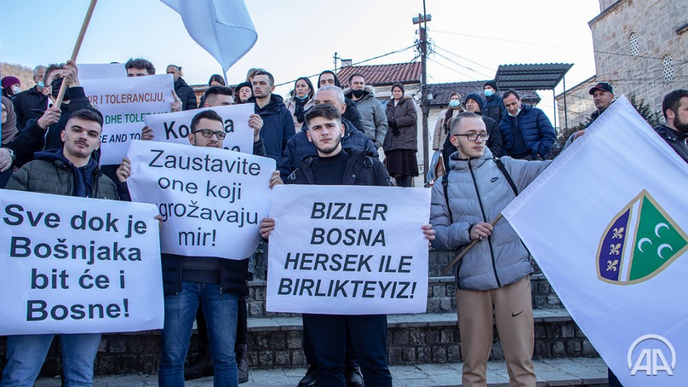 Ellerinde Bosna Hersek bayrakları taşıyan göstericiler, "Kosova, Bosna Hersek’in yanındadır", "Barış ve hoşgörüyü koruyun" ve "Boşnaklar var olduğu sürece Bosna da var olacaktır" yazılı dövizler taşıdı.
