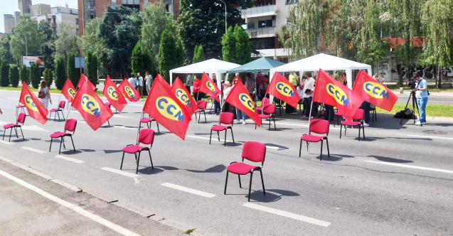 Polis, sağlık çalışanları, belediye işçileri ve kamudan çeşitli sektörlerden çalışanlar grev yaparken Üsküp’te göstericiler, parlamento binasının önüne milletvekillerinin sayısını temsilen 120 adet boş sandalye yerleştirdi.