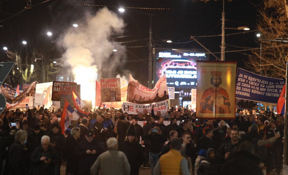 "Kosova Sırbistan'ın kalbidir", "Kutsal olanı vermiyoruz" yazılı dövizlerin açıldığı gösteride ayrıca "Yaşasın Putin" şeklinde slogan atıldı.