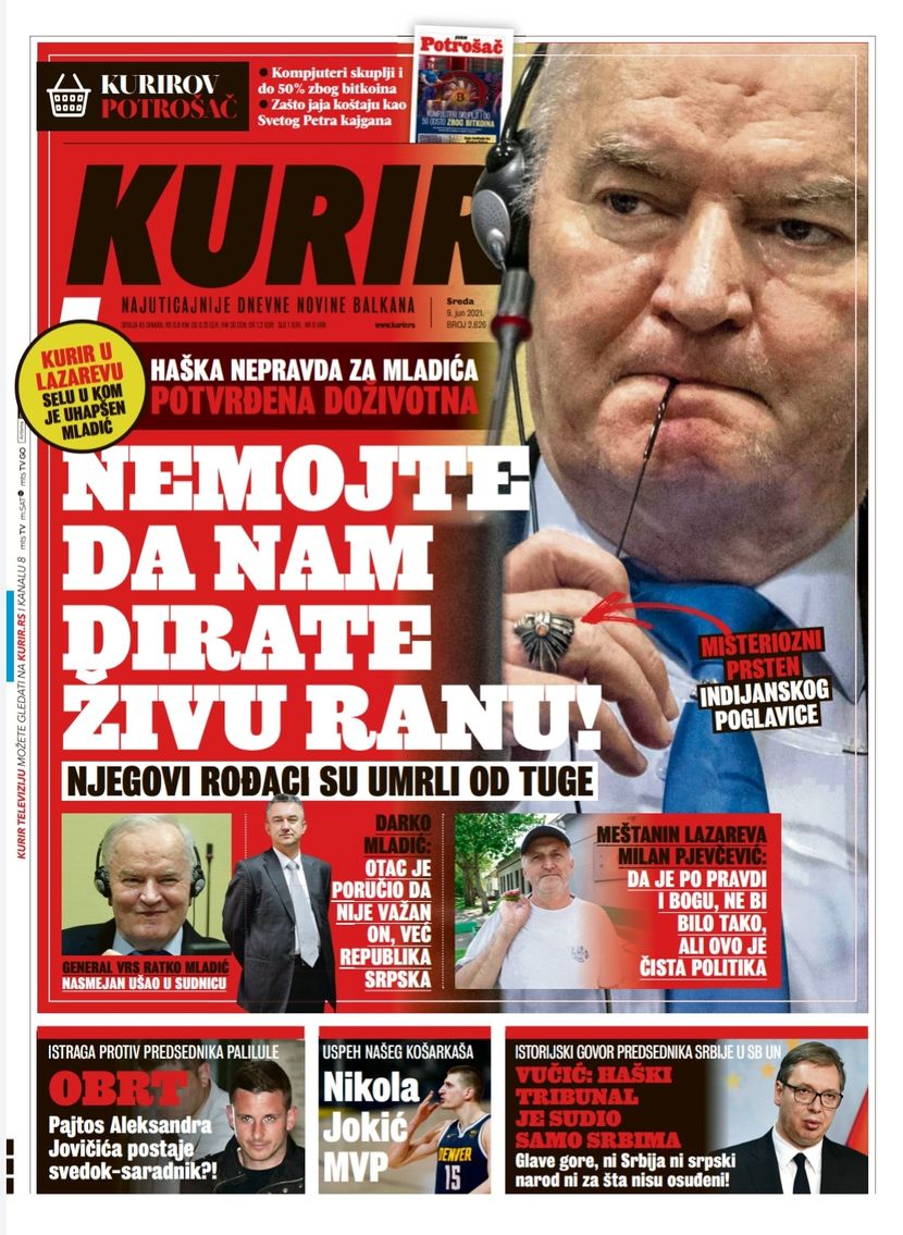 Telegraf gazetesi, “Çirkin karar onandı: Mladiç, yüzüğüyle Amerikalılara gizli bir mesaj gönderdi” manşetiyle çıktı.